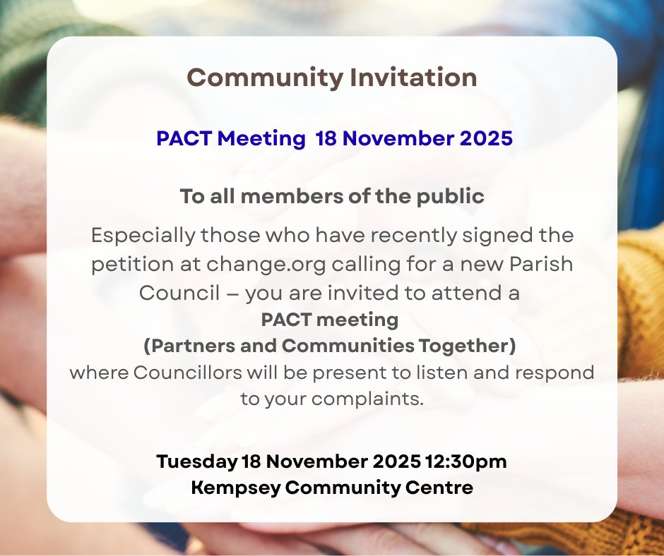The November PACT meeting clearly included discussions about Kempsey Parish Council, Kempsey Live, and the Change.org petition that had mobilised many residents to attend.